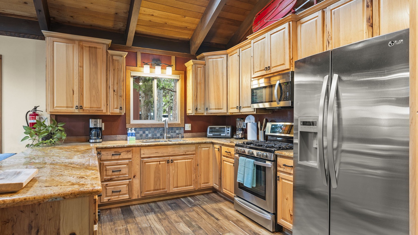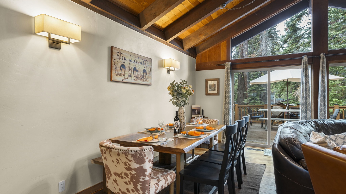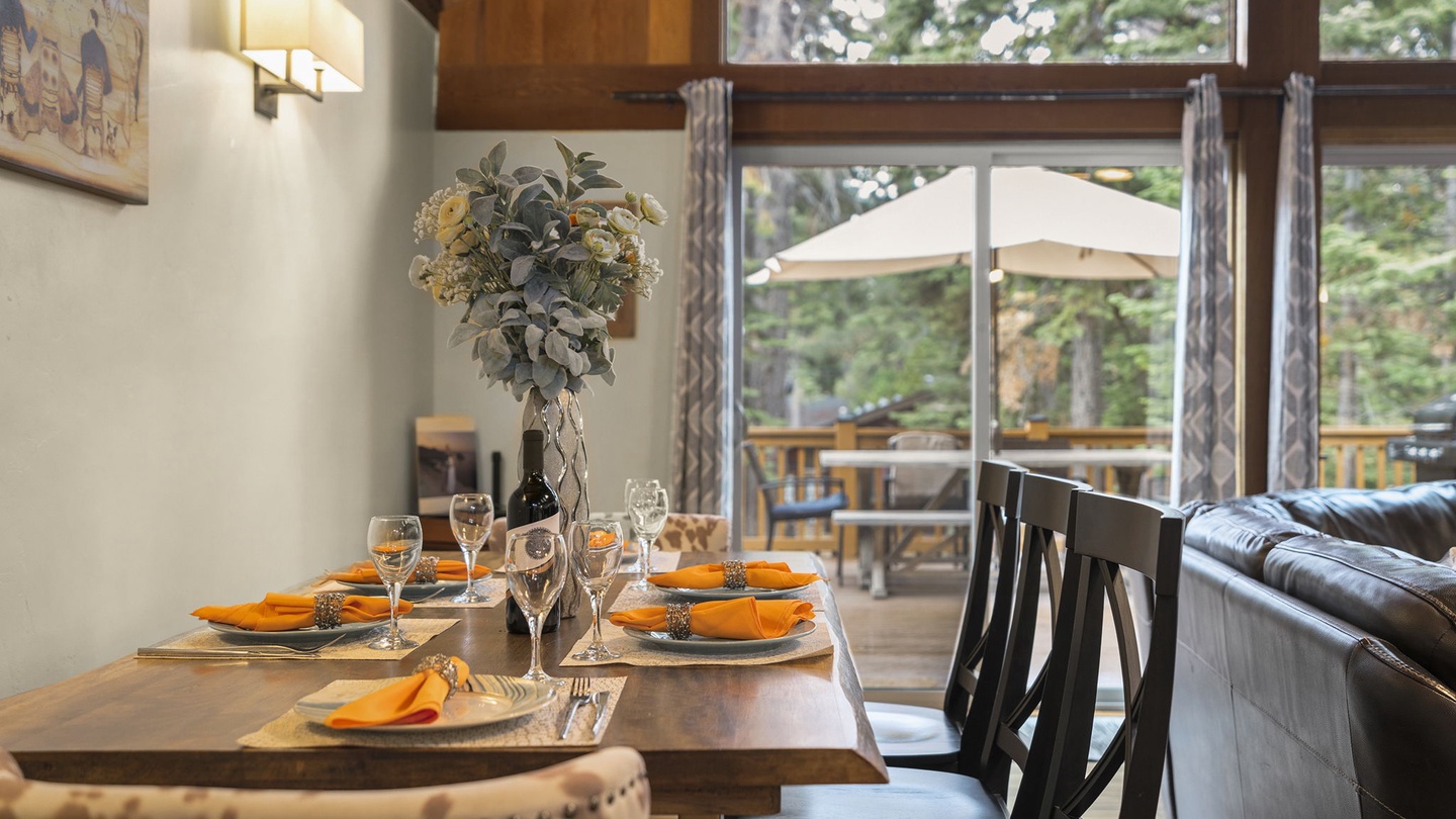 The fully equipped kitchen offers granite countertops, stainless-steel appliances, and knotty-pine cabinetry. Share meals at the spacious dining table set for eight, or open the sliding doors to dine outdoors on the large deck overlooking the pines.