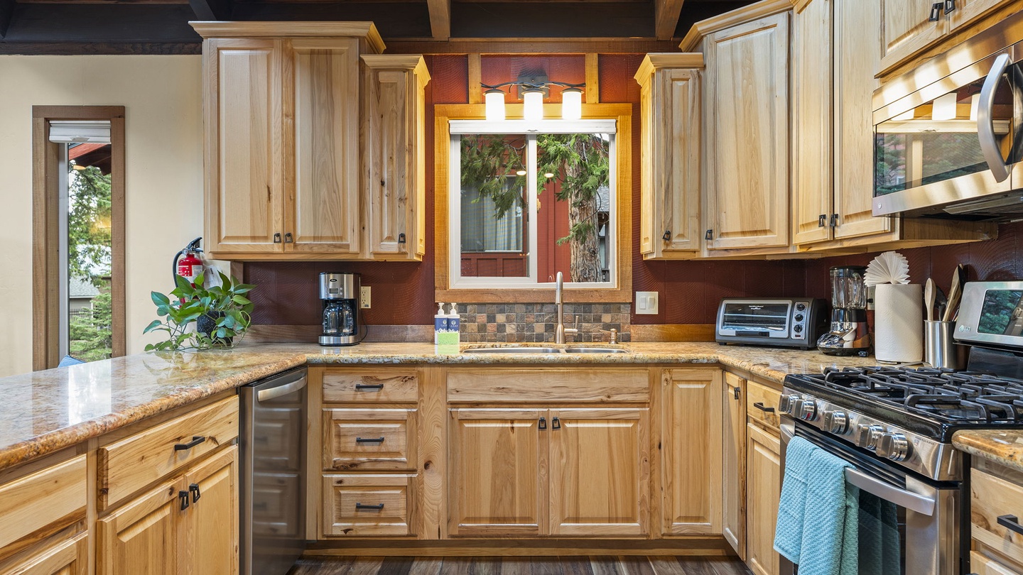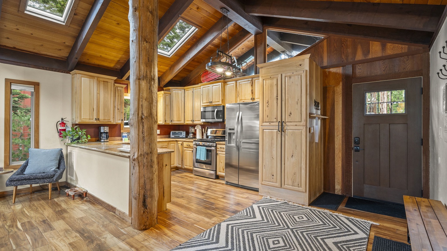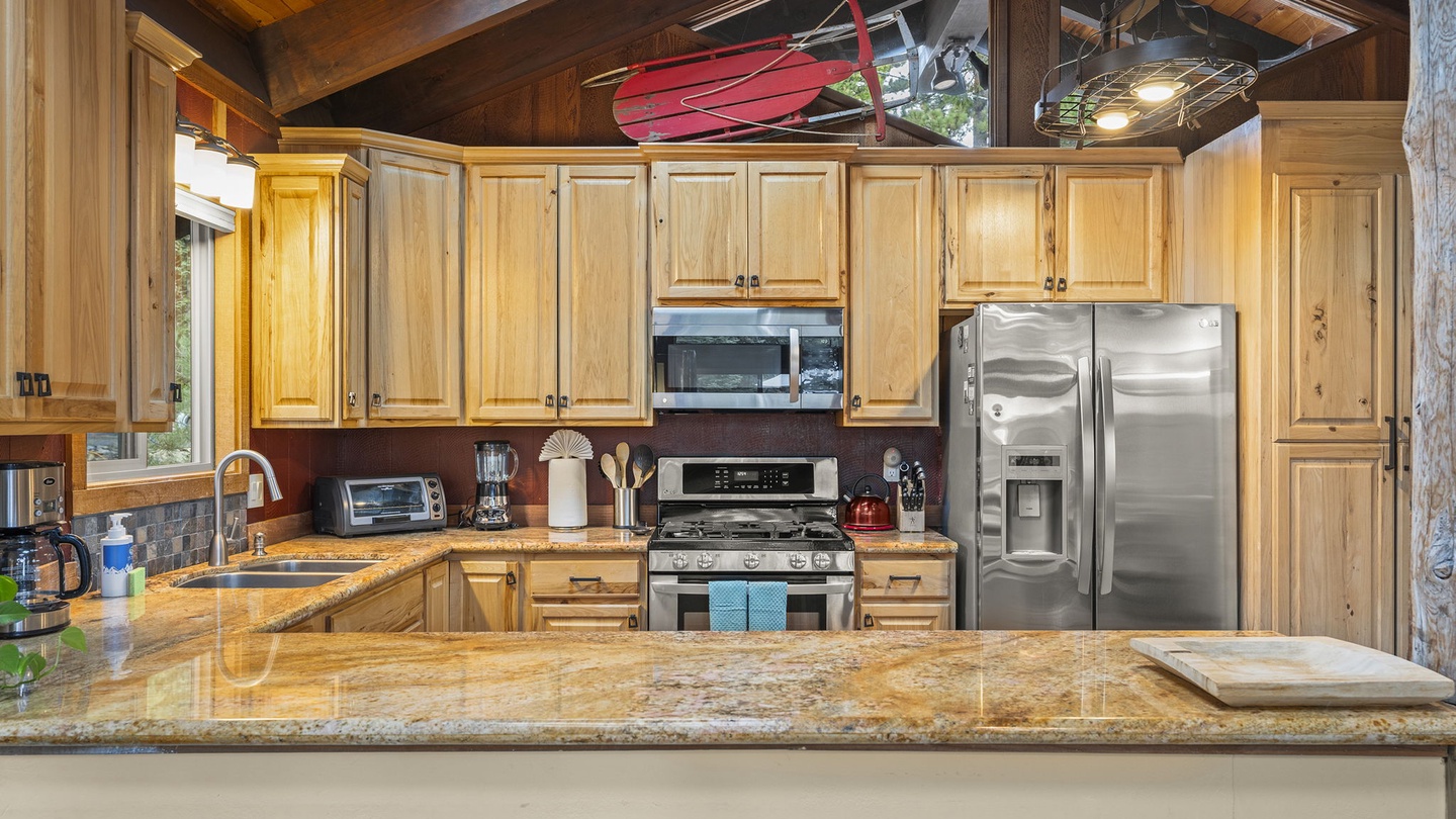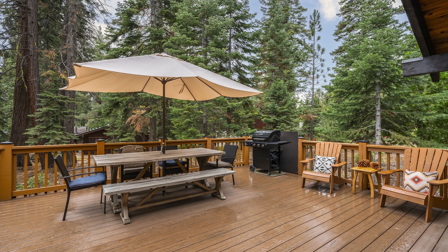 The fully equipped kitchen offers granite countertops, stainless-steel appliances, and knotty-pine cabinetry. Share meals at the spacious dining table set for eight, or open the sliding doors to dine outdoors on the large deck overlooking the pines.