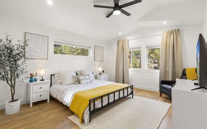 The primary suite is a luminous haven, adorned with high-end furnishings and a serene monochrome palette that sets the tone for tranquility. The king-sized bed, fitted with high thread count linens, promises nights of unparalleled comfort. Here you can relax and watch TV on the flatscreen or spend lazy mornings sipping coffee and enjoying the sun pouring in. The stunning five-piece ensuite bathroom, boasts a timeless black and white scheme, adorned with subway tiles and an elegant marble double vanity, creating a spa-like sanctuary within the comfort of your own private retreat.