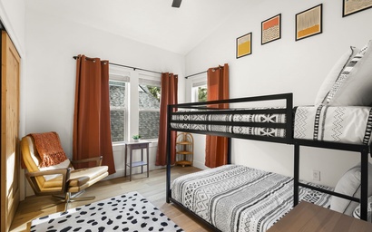 The guest bedrooms each have their own unique charm and offer twin-sized beds, perfect for both children and adults. Tastefully decorated with monochrome schemes and playful design elements, these rooms provide a cozy and inviting atmosphere, ensuring a restful and rejuvenating night's sleep for all. A bright, well-appointed, three-piece shared bathroom with a spacious vanity and contemporary fixtures caters to the needs of all guests, ensuring comfort and convenience throughout your stay.